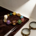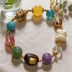This bracelet is centered on **Five Elements balance**, featuring natural crystals like yellow agate (Earth), amazonite (Wood), turquoise (Water), Yanyuan agate (Fire), and Hetian jade (Metal), paired with lion dance and enamel gold ornaments to form a complete Five Elements energy cycle. The lion dance, as an auspicious beast, wards off evil and attracts wealth; each crystal corresponds to different numerology needs, balancing personal Five Elements deficiencies and enhancing aura.